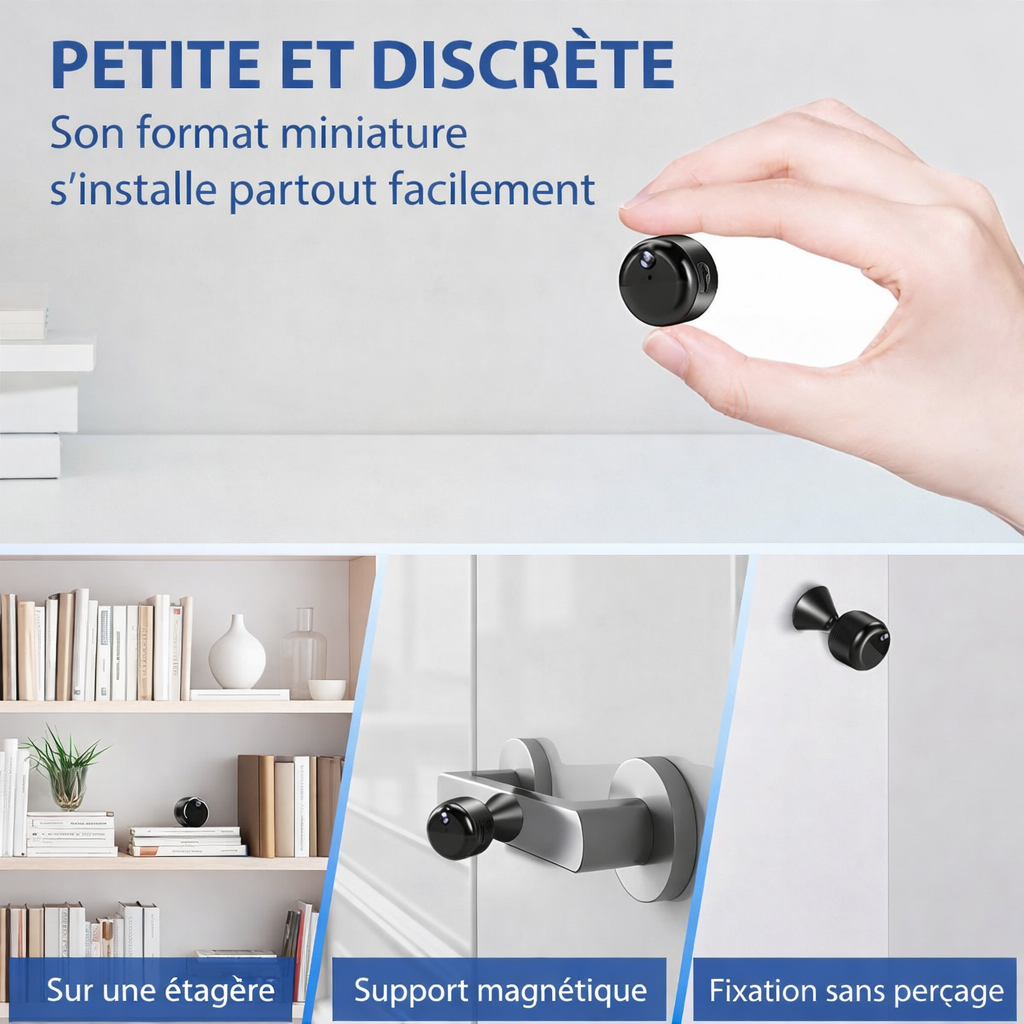 Ultra compacte et presque invisible, cette mini caméra s’installe partout en quelques secondes. Grâce à sa fixation magnétique et sans perçage, elle se place facilement sur une étagère, un mur ou toute surface métallique. Discrète mais performante, elle offre une surveillance efficace de votre intérieur tout en restant totalement invisible. Idéale pour la maison, les enfants, les animaux ou la sécurité du quotidien, elle allie simplicité, discrétion et tranquillité d’esprit.