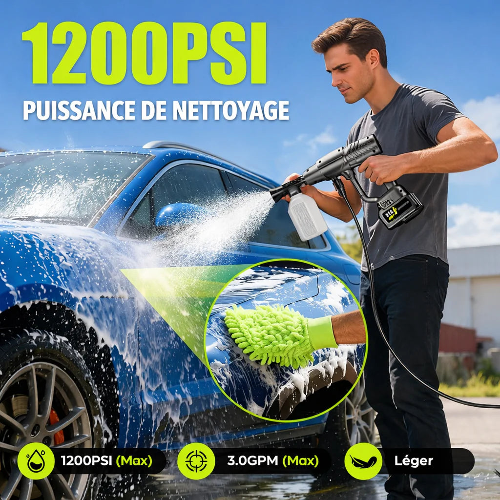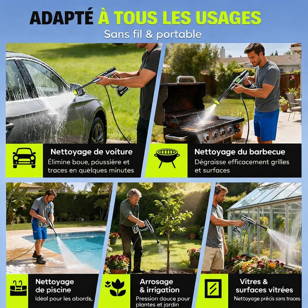 Conçu pour s’adapter à toutes les situations, ce nettoyeur haute pression sans fil offre une liberté totale d’utilisation, à la maison comme à l’extérieur. Grâce à sa conception portable et performante, il permet de nettoyer efficacement la voiture, le barbecue, la piscine, les surfaces vitrées ou encore d’arroser le jardin, sans contrainte de câble. Polyvalent, pratique et facile à manier, il garantit un nettoyage rapide, précis et sans effort pour tous vos usages du quotidien.
