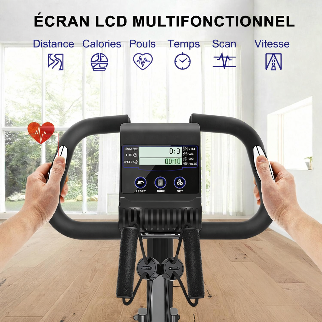 Ce vélo permet un entraînement complet du corps : jambes, bras, abdominaux et dos, grâce aux bandes de résistance intégrées et aux différentes positions (droite et semi-allongée).